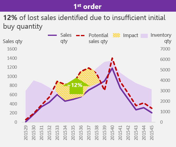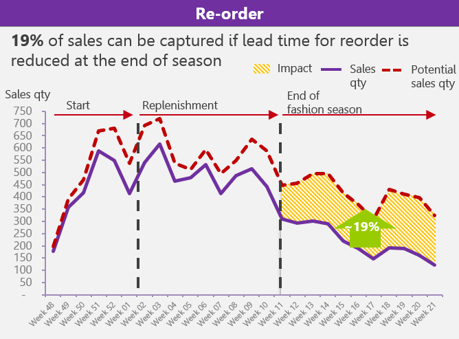 Planning for 1st buy and reorder requires different techniques. 1st buy relies on advanced forecast planning to prevent lost sales. Reorder planning should be supported by raw material and capacity booking to ensure that you can quickly replenish successful styles