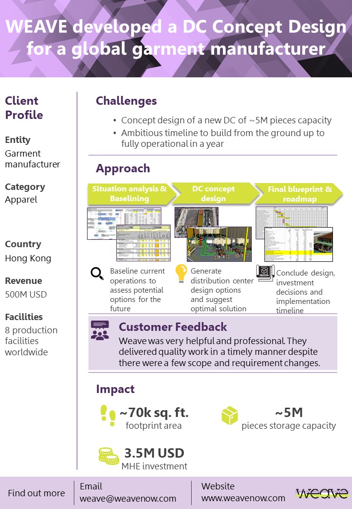 We helped a global Apparel Manufacturer based in Hong Kong develop a warehouse concept design for their new distribution center in Bangladesh.