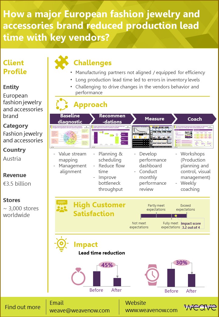 We partnered with a major European fashion jewelry and accessories brand to drive the production lead time down 30-45% at their key vendors.